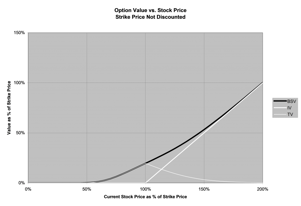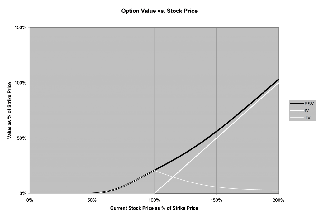 So long as the current price is less than the strike price (to the left of 100% in the above graph), the IV is zero. The higher the current price is, the higher the BSV, which in this range consists entirely of TV, will be. The TV is higher when the current stock price is higher in this range because the higher the price, both the more likely it is that the option will be in the money at expiration and the further in the money it is likely to be if it is in the money at expiration.
