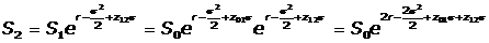 The above derivation of the equation for a 2-year change in price from the equations for consecutive 1-year changes in price illustrates another important point about the lognormal random walk model for stock prices. That point is that if one models the change for a time period as taking place in a single step or taking place in several smaller steps one gets the same answer. Thus, one does not need to model smaller steps. You may recall from the Part I material that this is not the case for percent changes; for percent changes the results depend on how finely one has broken down the time intervals.