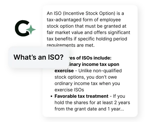 Users can ask any equity-related question and get a clear, accessible answer in seconds, from “How are ISOs taxed?” to “How could this affect my taxes?” Ask Grant fields both common and complex questions in language that’s easy to understand.